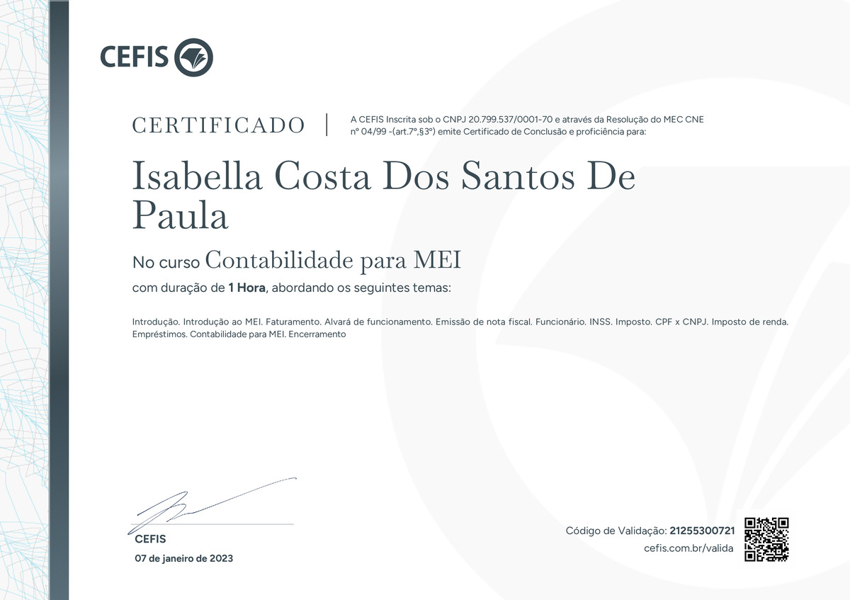 O certificado acima atesta que ISABELLA COSTA DOS SANTOS DE PAULA concluiu com êxito o curso Contabilidade para MEI em 07/01/2023 às 20:01:22,