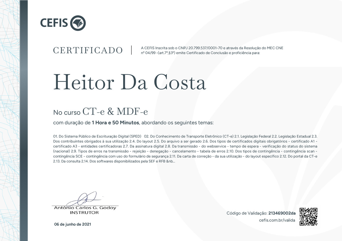 O certificado acima atesta que Heitor da Costa concluiu com êxito o curso CT-e & MDF-e em 06/06/2021 às 22:06:56, ministrado por Antônio Carlos Godoi.