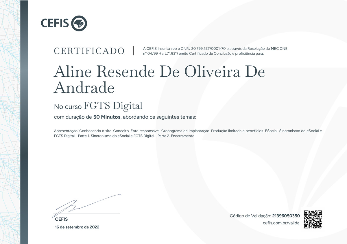 O certificado acima atesta que ALINE RESENDE DE OLIVEIRA DE ANDRADE concluiu com êxito o curso FGTS Digital em 16/09/2022 às 10:09:42, ministrado por JEFFERSON DANTAS.