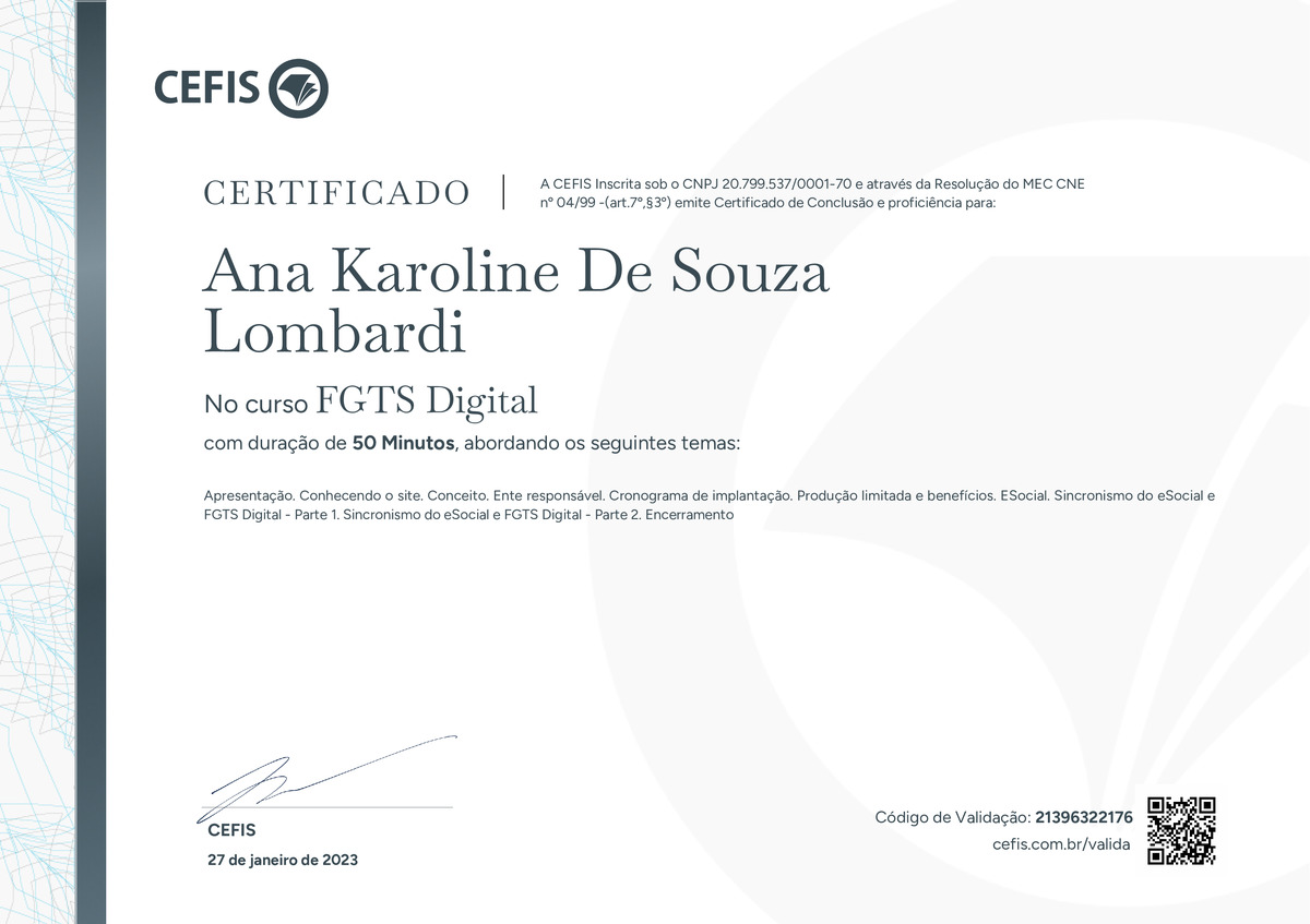 O certificado acima atesta que ANA KAROLINE DE SOUZA LOMBARDI concluiu com êxito o curso FGTS Digital em 27/01/2023 às 13:01:03, ministrado por JEFFERSON DANTAS.