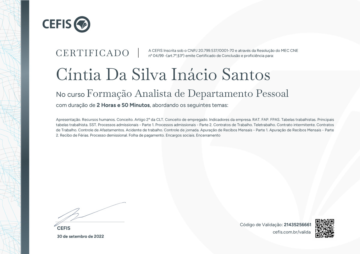 O certificado acima atesta que CÍNTIA DA SILVA INÁCIO SANTOS concluiu com êxito o curso Formação Analista de Departamento Pessoal em 30/09/2022 às 11:09:19,