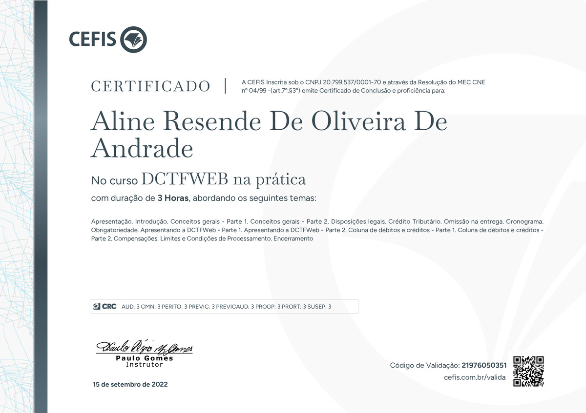 O certificado acima atesta que ALINE RESENDE DE OLIVEIRA DE ANDRADE concluiu com êxito o curso DCTFWEB na prática em 15/09/2022 às 10:09:13,