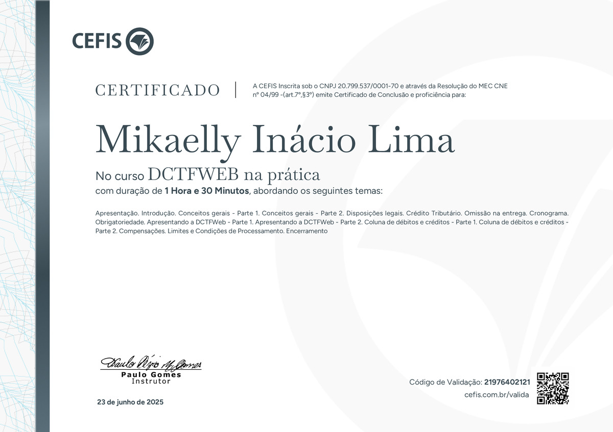 O certificado acima atesta que MIKAELLY INÁCIO LIMA concluiu com êxito o curso DCTFWEB na prática em 23/06/2025 às 23:06:52,
