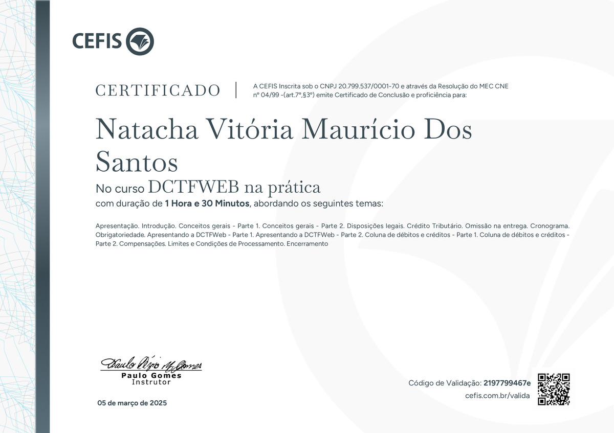 O certificado acima atesta que NATACHA VITÓRIA MAURÍCIO DOS SANTOS concluiu com êxito o curso DCTFWEB na prática em 05/03/2025 às 17:03:22,