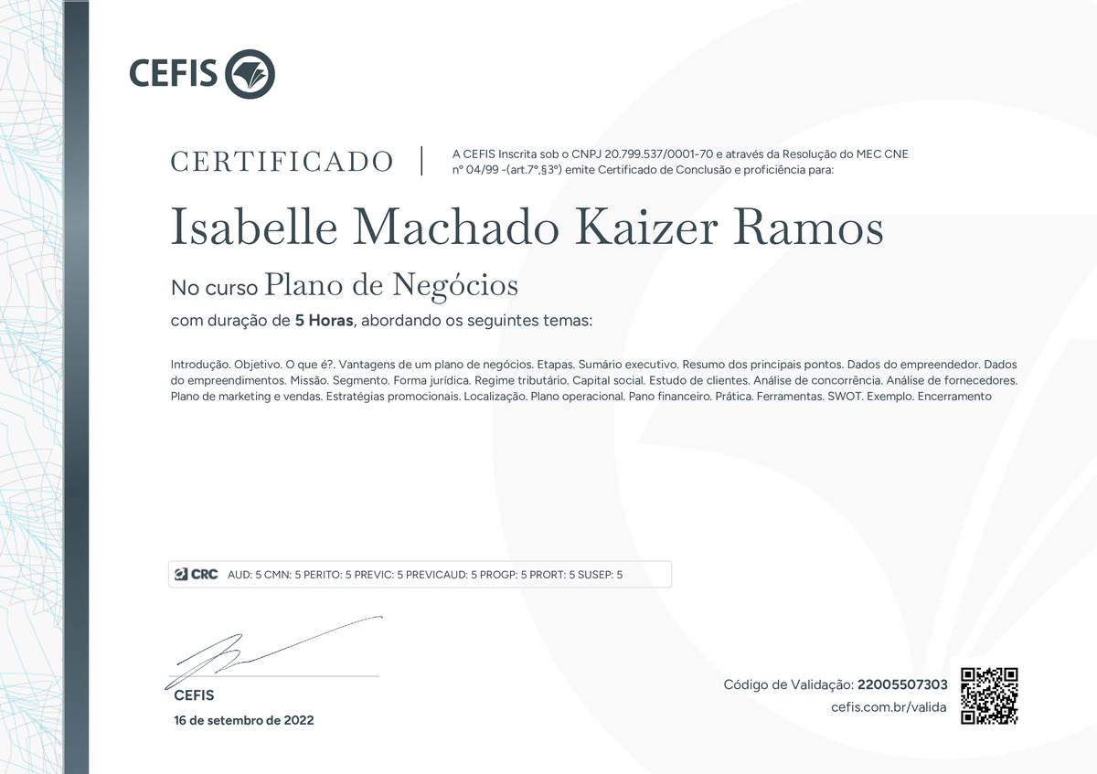 O certificado acima atesta que ISABELLE MACHADO KAIZER RAMOS concluiu com êxito o curso Plano de Negócios em 16/09/2022 às 10:09:23, ministrado por MAURI JOSÉ ALBERTI.
