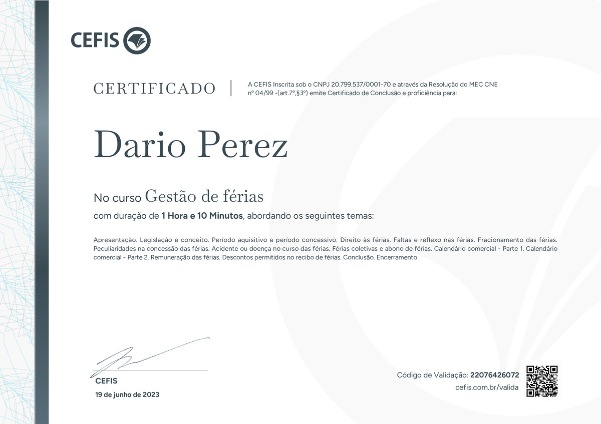 O certificado acima atesta que DARIO PEREZ concluiu com êxito o curso Gestão de férias em 19/06/2023 às 18:06:04,