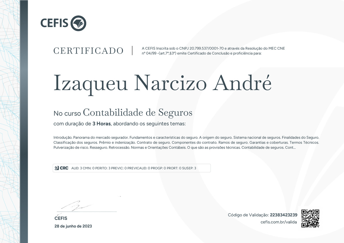 O certificado acima atesta que IZAQUEU NARCIZO ANDRÉ concluiu com êxito o curso Contabilidade de Seguros em 28/06/2023 às 12:06:20,