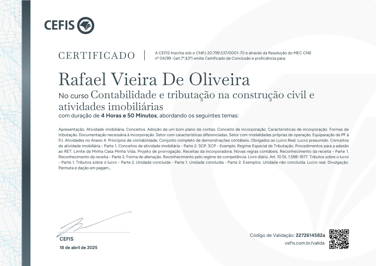 O certificado acima atesta que RAFAEL VIEIRA DE OLIVEIRA concluiu com êxito o curso Contabilidade e tributação na construção civil e atividades imobiliárias em 18/04/2025 às 20:04:37,