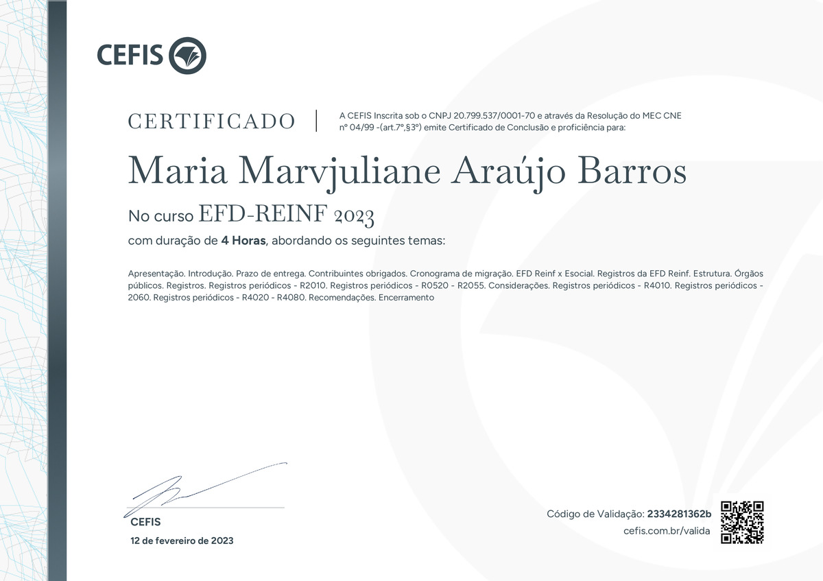 O certificado acima atesta que Maria Marvjuliane Araújo Barros concluiu com êxito o curso EFD-REINF 2023 em 12/02/2023 às 09:02:48, ministrado por Davi Gobatto.