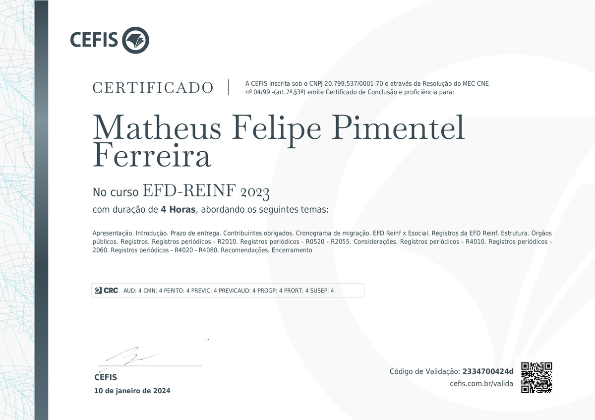O certificado acima atesta que MATHEUS FELIPE PIMENTEL FERREIRA concluiu com êxito o curso EFD-REINF 2023 em 10/01/2024 às 11:01:40,