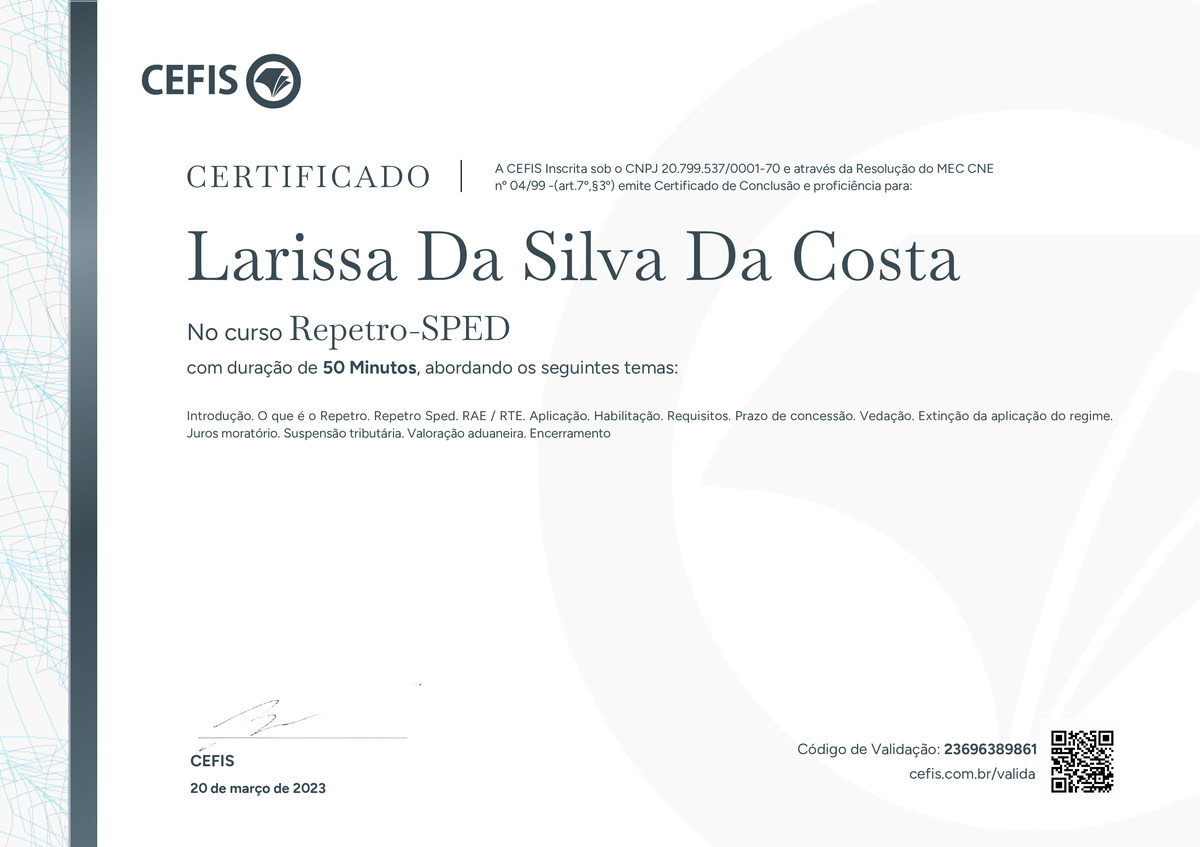 O certificado acima atesta que LARISSA DA SILVA DA COSTA concluiu com êxito o curso Repetro-SPED em 20/03/2023 às 17:03:53,
