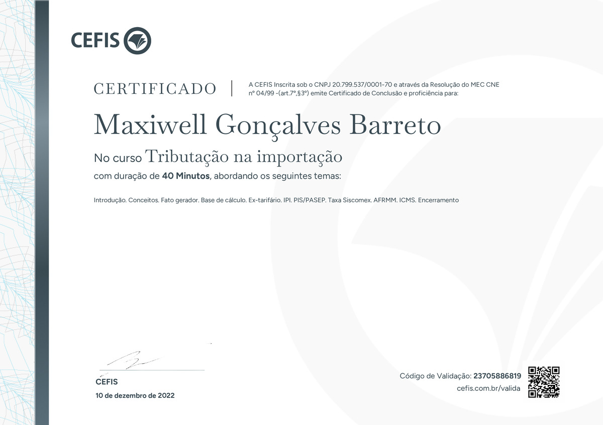 O certificado acima atesta que MAXIWELL GONÇALVES BARRETO concluiu com êxito o curso Tributação na importação em 10/12/2022 às 18:12:26,