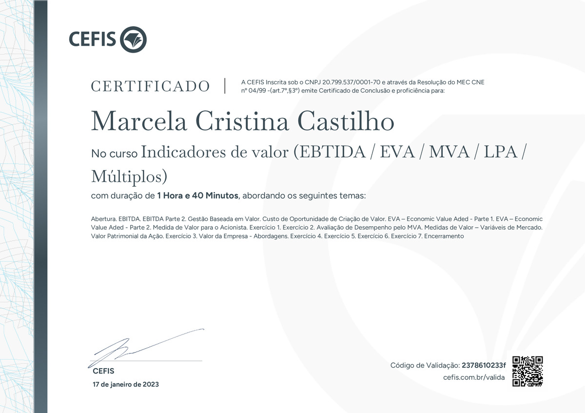 O certificado acima atesta que MARCELA CRISTINA CASTILHO concluiu com êxito o curso Indicadores de valor (EBTIDA / EVA / MVA / LPA / Múltiplos) em 17/01/2023 às 15:01:00, ministrado por Rosana Gonzalez Dannibale.