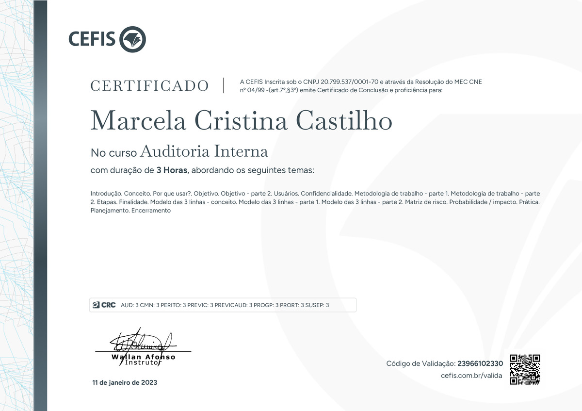 O certificado acima atesta que MARCELA CRISTINA CASTILHO concluiu com êxito o curso Auditoria Interna em 11/01/2023 às 12:01:07, ministrado por WALLAN AFONSO.