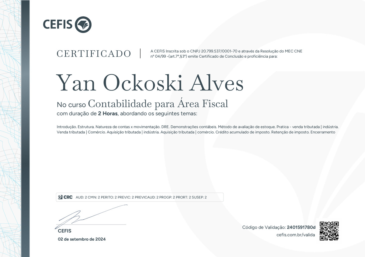 O certificado acima atesta que YAN OCKOSKI ALVES concluiu com êxito o curso Contabilidade para Área Fiscal em 02/09/2024 às 06:09:11,
