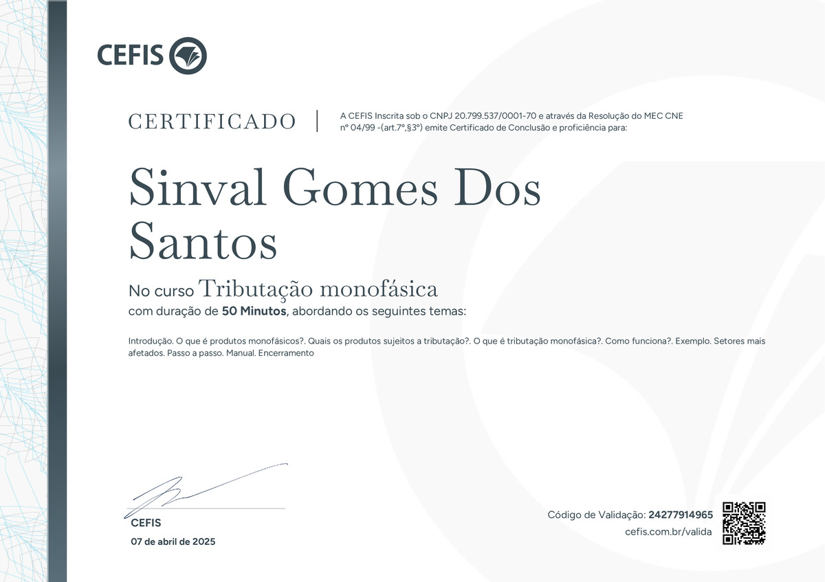 O certificado acima atesta que SINVAL GOMES DOS SANTOS concluiu com êxito o curso Tributação monofásica em 07/04/2025 às 14:04:01,