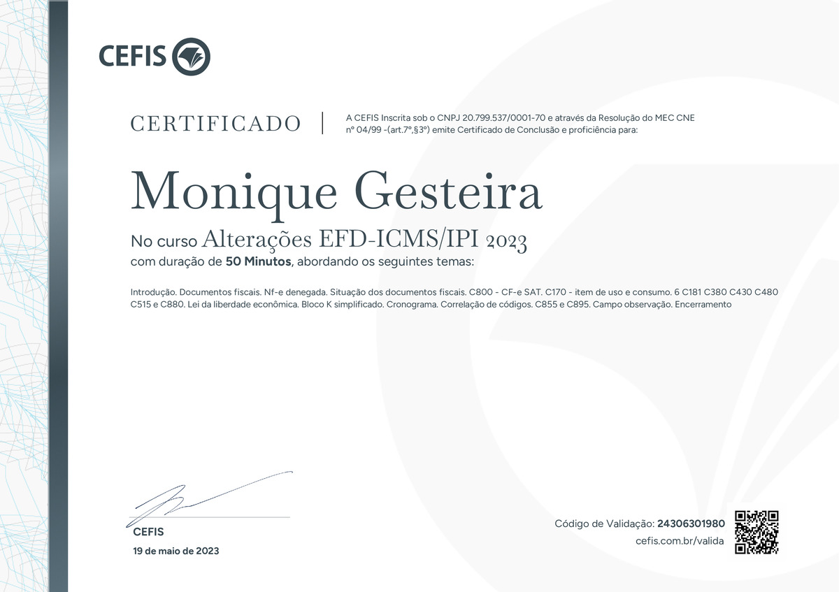 O certificado acima atesta que MONIQUE GESTEIRA concluiu com êxito o curso Alterações EFD-ICMS/IPI 2023 em 19/05/2023 às 10:05:07,
