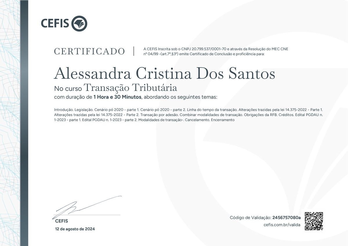 O certificado acima atesta que ALESSANDRA CRISTINA DOS SANTOS concluiu com êxito o curso Transação Tributária em 12/08/2024 às 00:08:19,