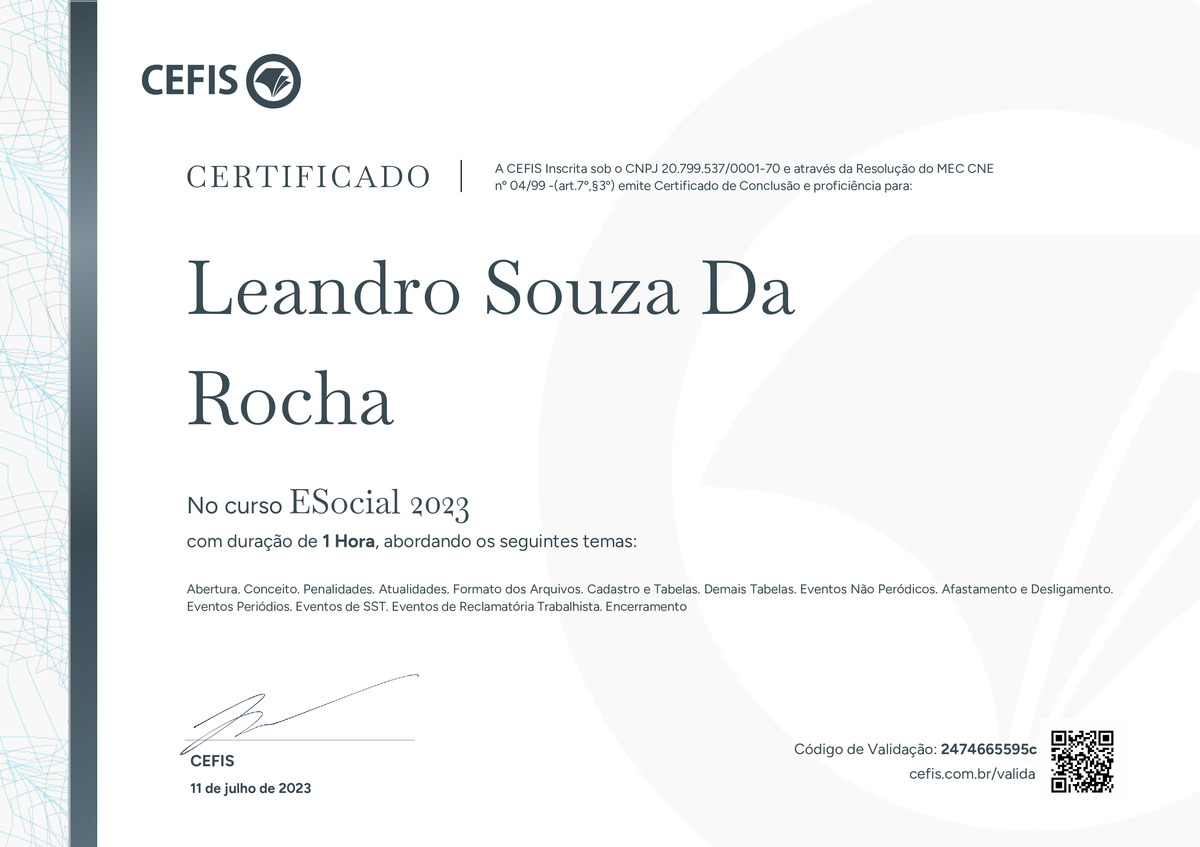 O certificado acima atesta que LEANDRO SOUZA DA ROCHA concluiu com êxito o curso ESocial 2023 em 11/07/2023 às 23:07:39,