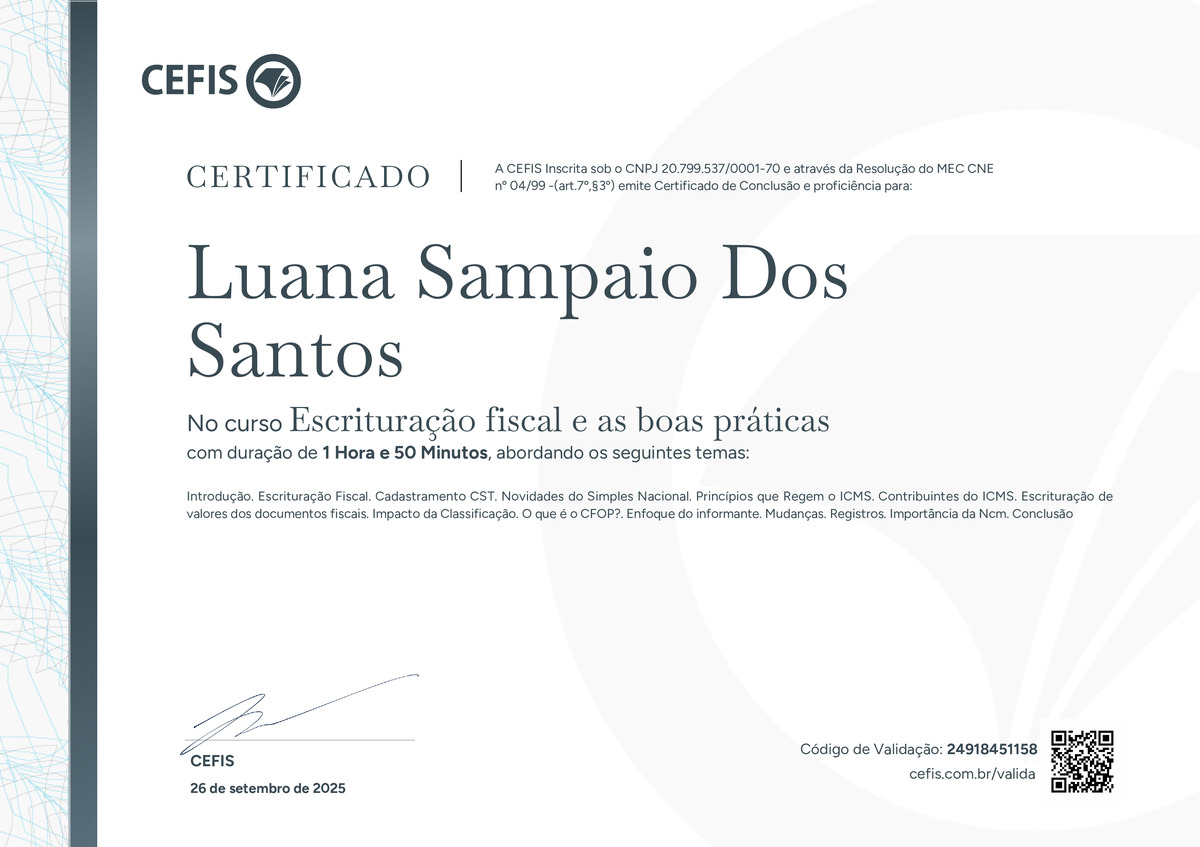 O certificado acima atesta que LUANA SAMPAIO DOS SANTOS concluiu com êxito o curso Escrituração fiscal e as boas práticas em 26/09/2025 às 10:09:54,