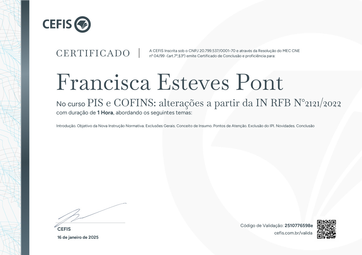 O certificado acima atesta que FRANCISCA ESTEVES PONT concluiu com êxito o curso PIS e COFINS: alterações a partir da IN RFB N°2121/2022 em 16/01/2025 às 21:01:28,