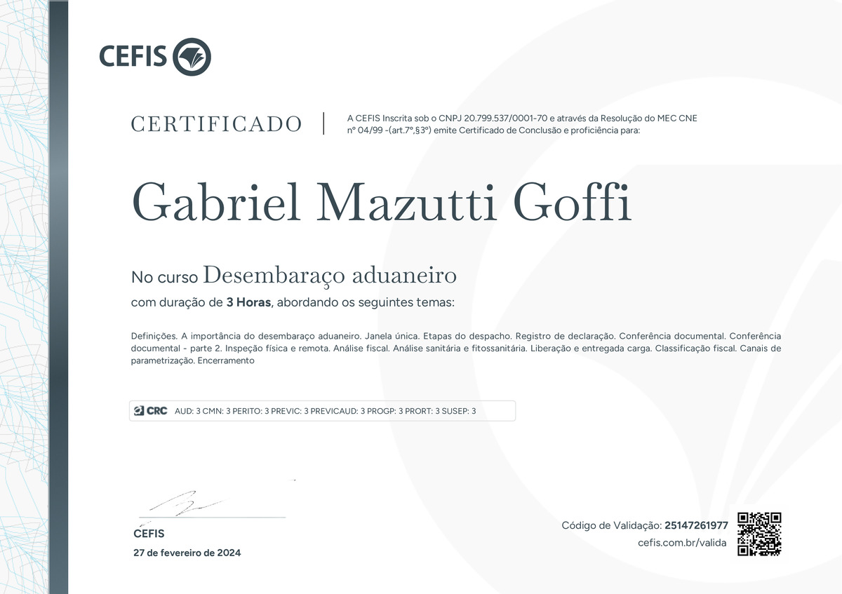O certificado acima atesta que GABRIEL MAZUTTI GOFFI concluiu com êxito o curso Desembaraço aduaneiro em 27/02/2024 às 15:02:26, ministrado por Raquel Cavalcanti.