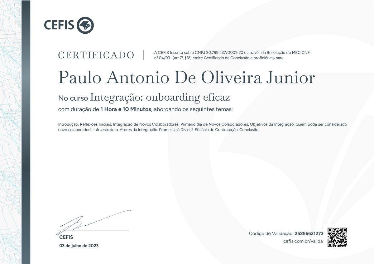 O certificado acima atesta que PAULO ANTONIO DE OLIVEIRA JUNIOR concluiu com êxito o curso Integração: onboarding eficaz em 03/07/2023 às 15:07:49,