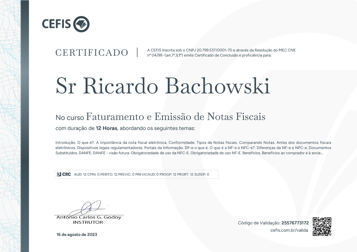O certificado acima atesta que SR RICARDO BACHOWSKI concluiu com êxito o curso Faturamento e Emissão de Notas Fiscais em 16/08/2023 às 08:08:02,