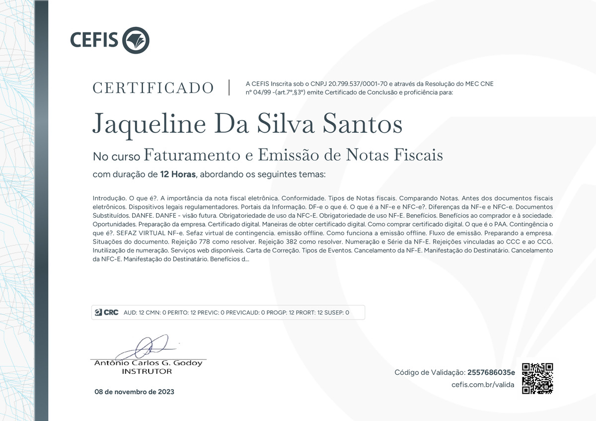 O certificado acima atesta que JAQUELINE DA SILVA SANTOS concluiu com êxito o curso Faturamento e Emissão de Notas Fiscais em 08/11/2023 às 12:11:25,