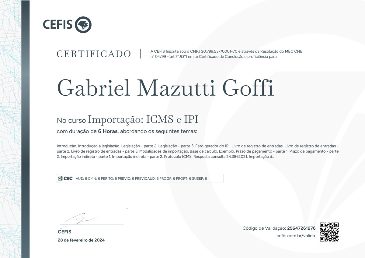 O certificado acima atesta que GABRIEL MAZUTTI GOFFI concluiu com êxito o curso Importação: ICMS e IPI em 28/02/2024 às 09:02:30,