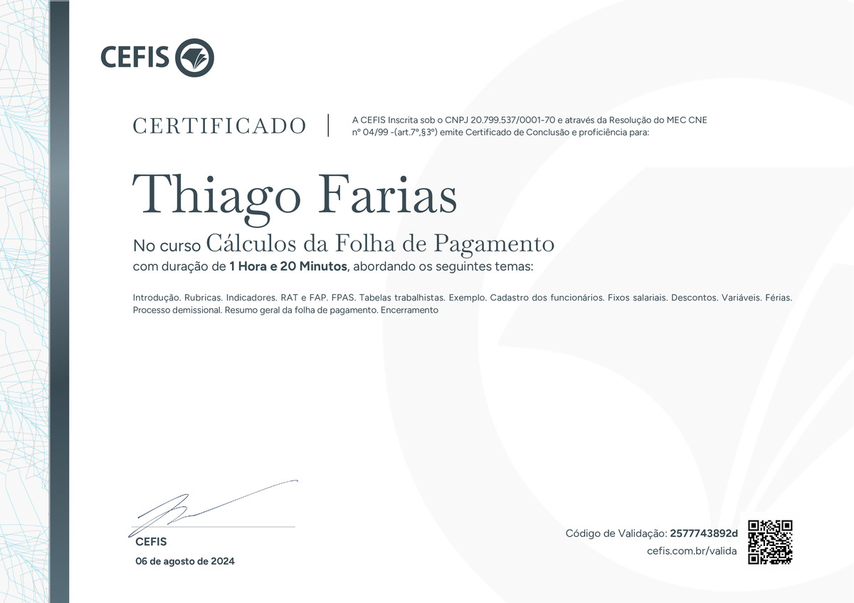 O certificado acima atesta que Thiago Farias concluiu com êxito o curso Cálculos da Folha de Pagamento em 06/08/2024 às 07:08:08,