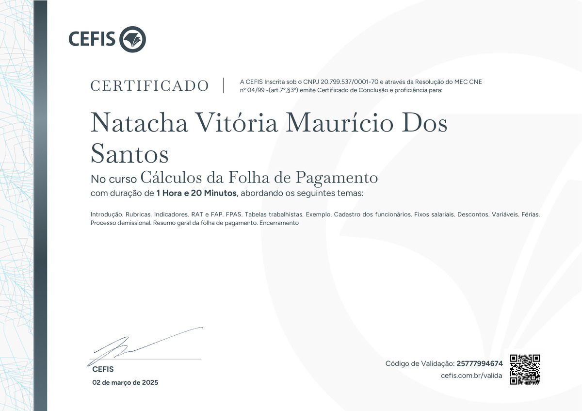 O certificado acima atesta que NATACHA VITÓRIA MAURÍCIO DOS SANTOS concluiu com êxito o curso Cálculos da Folha de Pagamento em 02/03/2025 às 11:03:02,