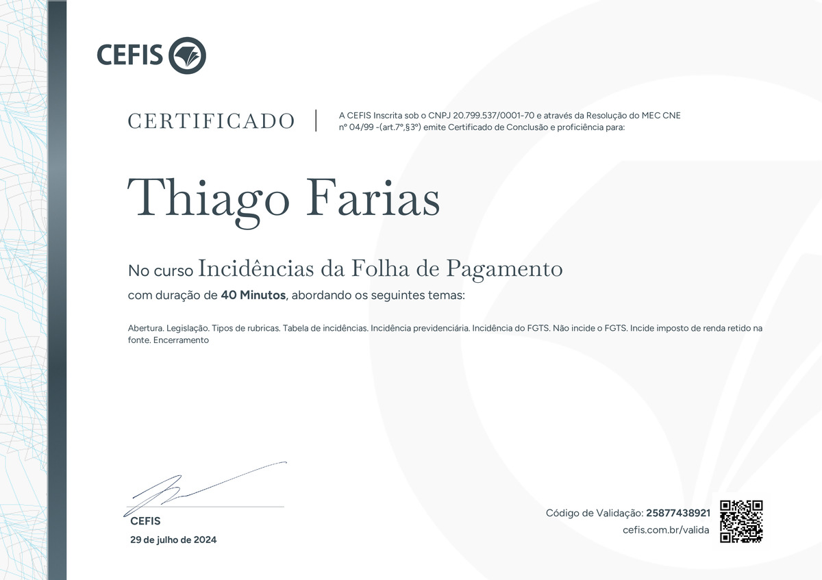 O certificado acima atesta que THIAGO FARIAS concluiu com êxito o curso Incidências da Folha de Pagamento em 29/07/2024 às 06:07:05,