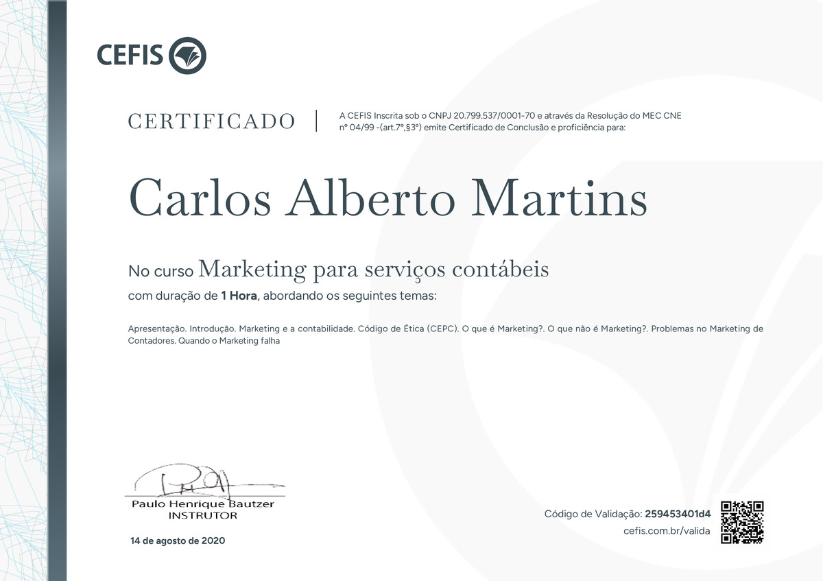 O certificado acima atesta que CARLOS ALBERTO MARTINS concluiu com êxito o curso Marketing para serviços contábeis em 14/08/2020 às 09:08:21,