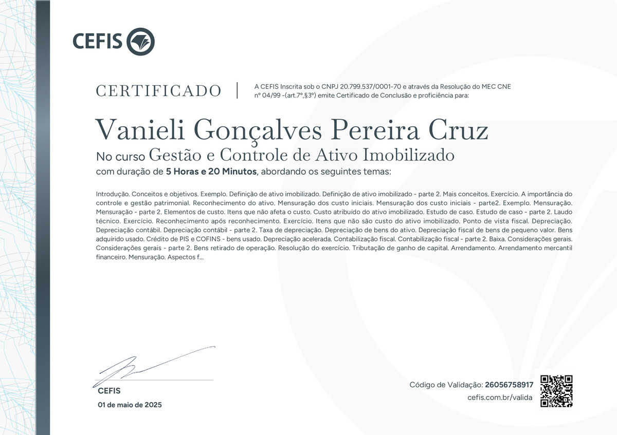 O certificado acima atesta que VANIELI GONÇALVES PEREIRA CRUZ concluiu com êxito o curso Gestão e Controle de Ativo Imobilizado em 01/05/2025 às 15:05:35,