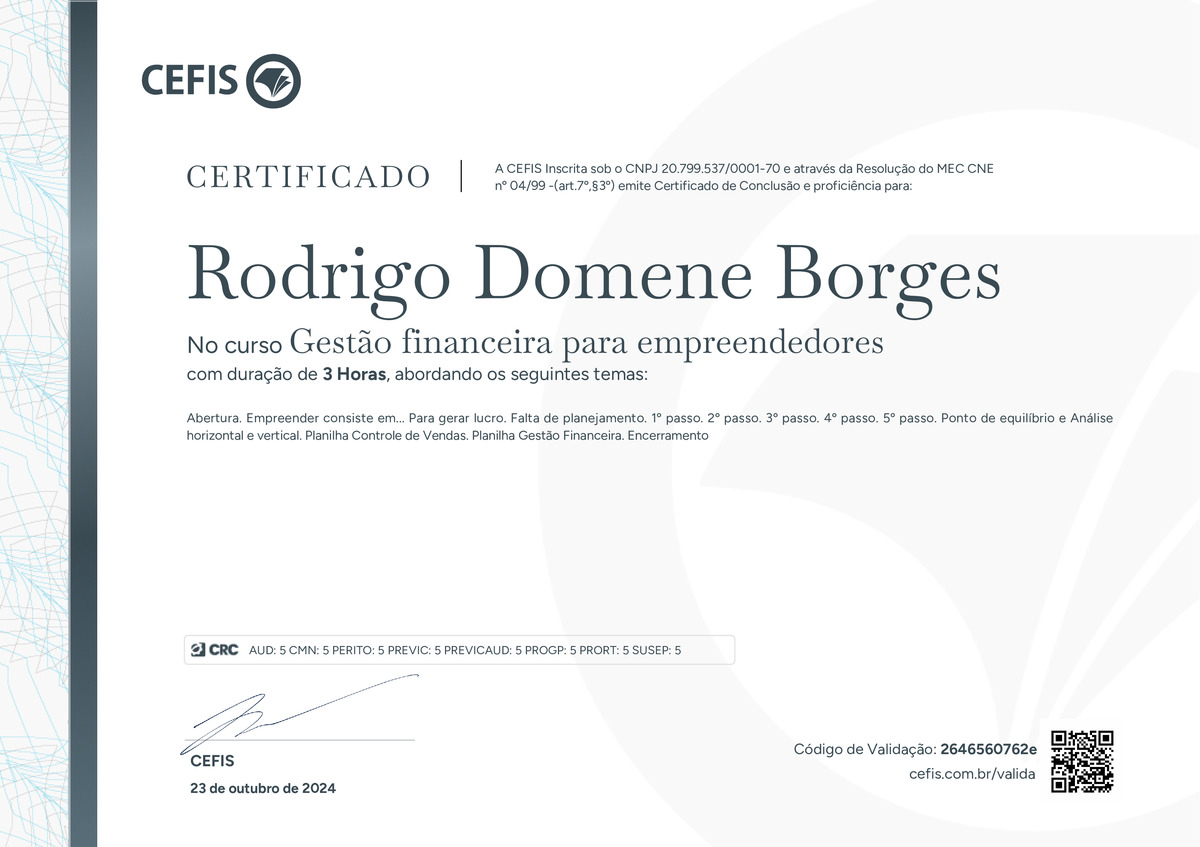 O certificado acima atesta que RODRIGO DOMENE BORGES concluiu com êxito o curso Gestão financeira para empreendedores em 23/10/2024 às 16:10:54,