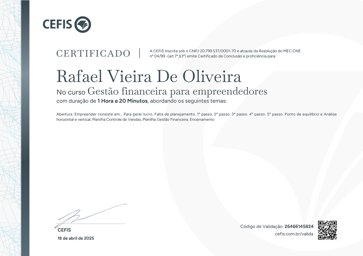 O certificado acima atesta que RAFAEL VIEIRA DE OLIVEIRA concluiu com êxito o curso Gestão financeira para empreendedores em 18/04/2025 às 20:04:23,