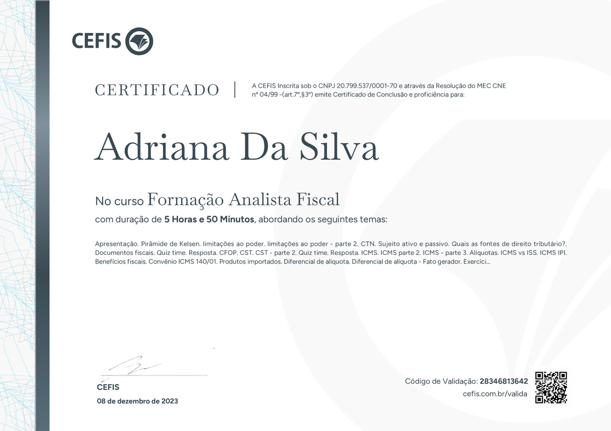 O certificado acima atesta que ADRIANA DA SILVA concluiu com êxito o curso Formação Analista Fiscal em 08/12/2023 às 11:12:25, ministrado por JOÃO OLIVEIRA.