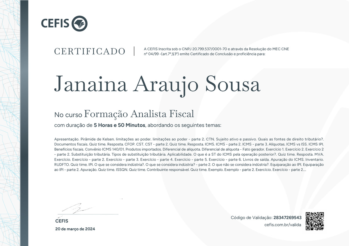O certificado acima atesta que JANAINA ARAUJO SOUSA concluiu com êxito o curso Formação Analista Fiscal em 20/03/2024 às 21:03:07,