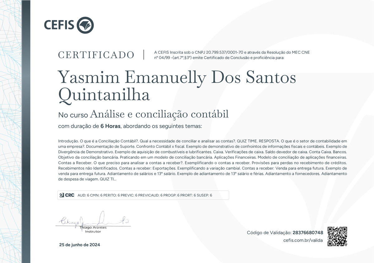 O certificado acima atesta que YASMIM EMANUELLY DOS SANTOS QUINTANILHA concluiu com êxito o curso Análise e conciliação contábil em 25/06/2024 às 14:06:47,