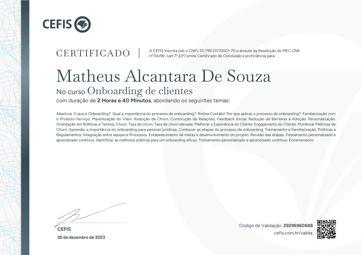 O certificado acima atesta que MATHEUS ALCANTARA DE SOUZA concluiu com êxito o curso Onboarding de clientes em 26/12/2023 às 15:12:17, ministrado por LUCIMAR GOMES FERREIRA.