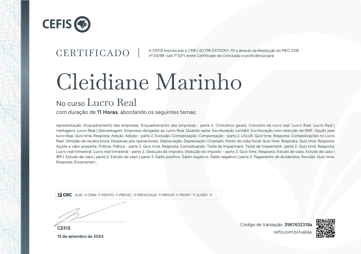 O certificado acima atesta que CLEIDIANE MARINHO concluiu com êxito o curso Lucro Real em 15/09/2024 às 20:09:22, ministrado por ARNÓBIO DURÃES.