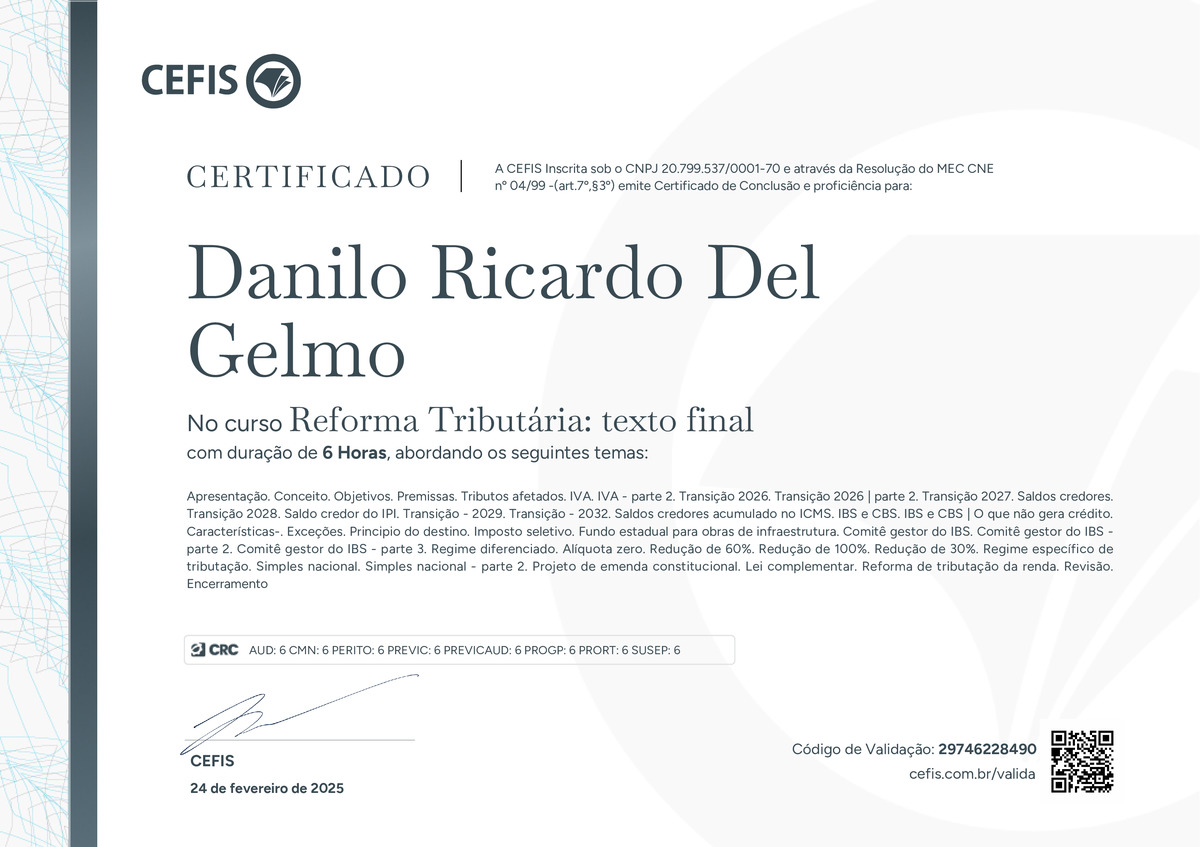 O certificado acima atesta que DANILO RICARDO DEL GELMO concluiu com êxito o curso Reforma Tributária: texto final em 24/02/2025 às 20:02:36, ministrado por Wellington Santos.