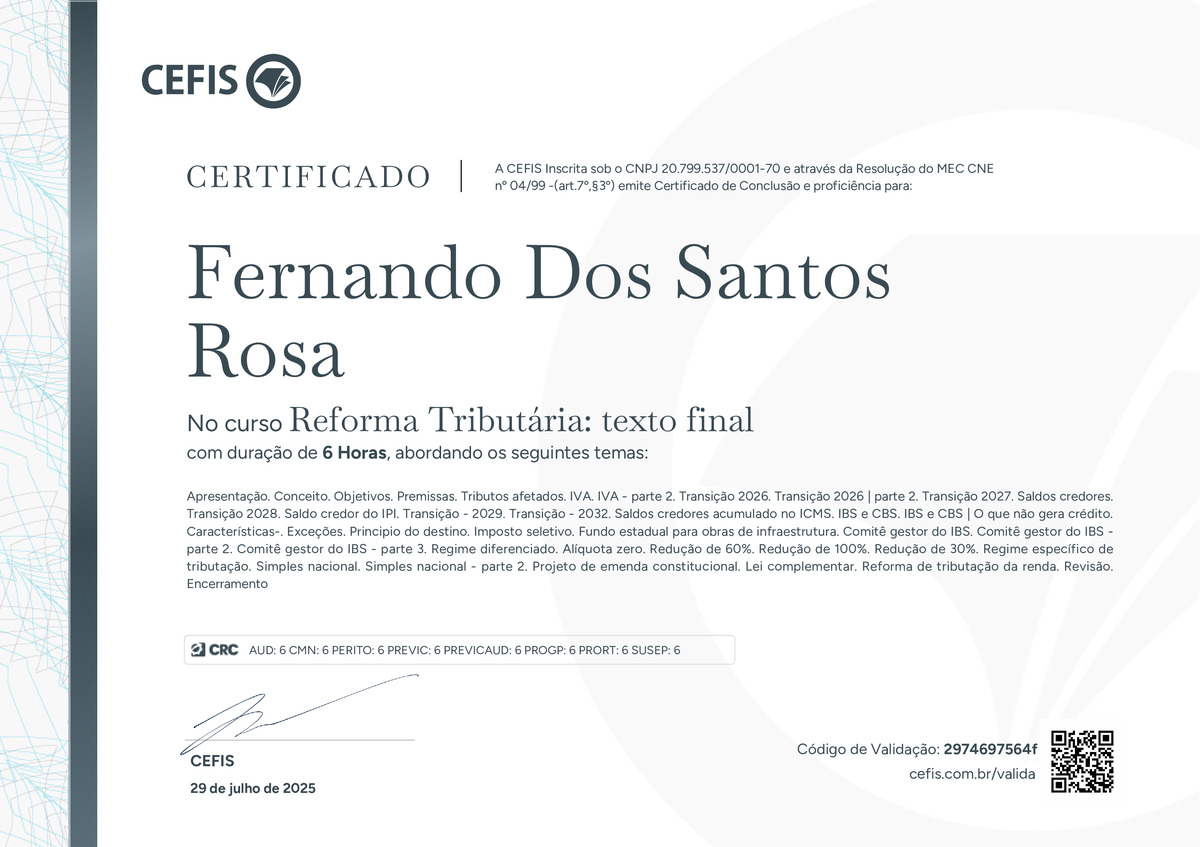 O certificado acima atesta que FERNANDO DOS SANTOS ROSA concluiu com êxito o curso Reforma Tributária: texto final em 29/07/2025 às 16:07:06,