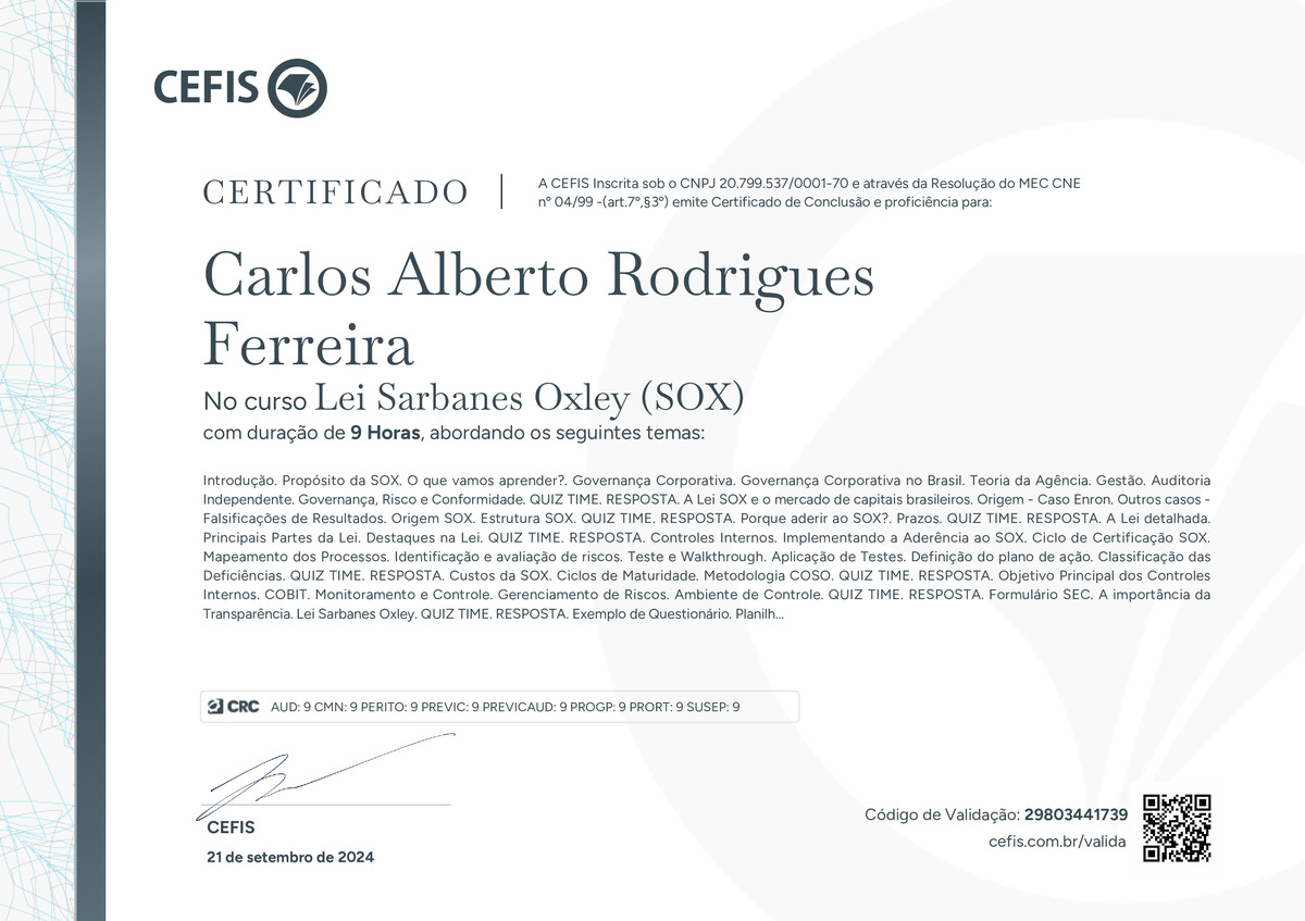 O certificado acima atesta que CARLOS ALBERTO RODRIGUES FERREIRA concluiu com êxito o curso Lei Sarbanes Oxley (SOX) em 21/09/2024 às 15:09:28,