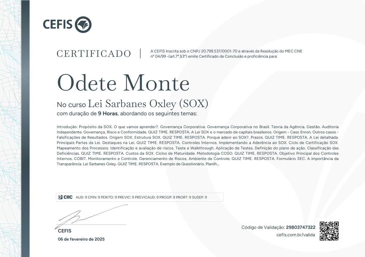 O certificado acima atesta que ODETE MONTE concluiu com êxito o curso Lei Sarbanes Oxley (SOX) em 06/02/2025 às 13:02:58,