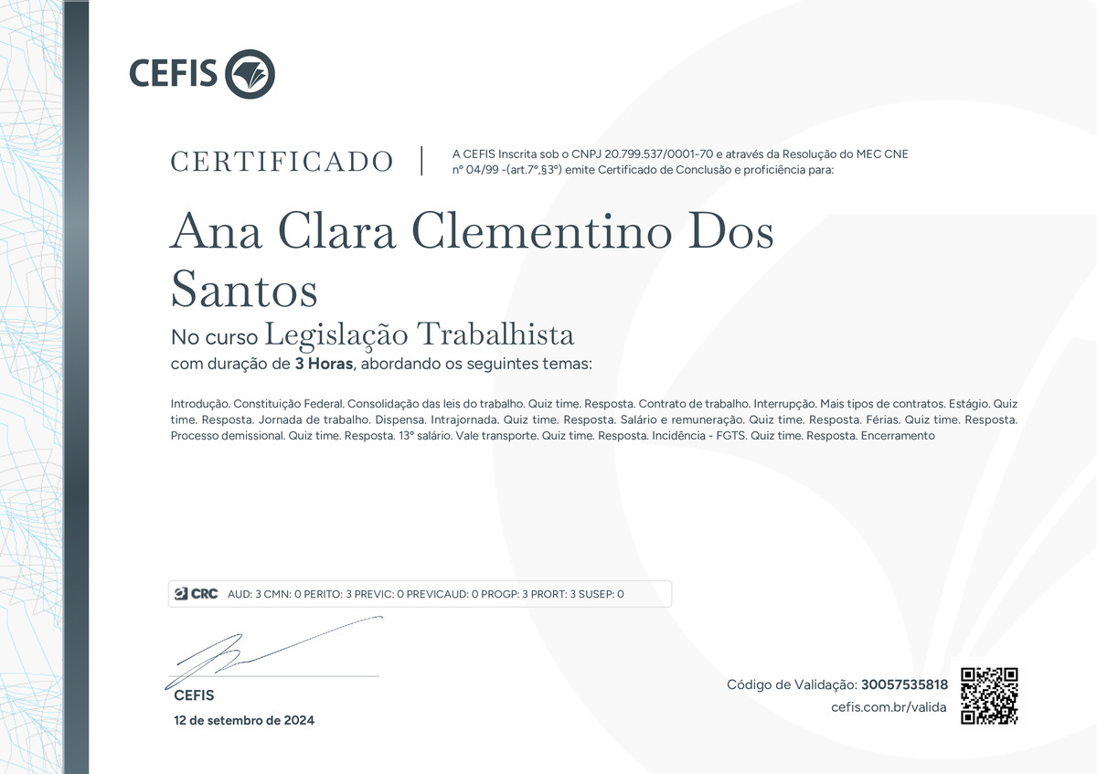 O certificado acima atesta que ANA CLARA CLEMENTINO DOS SANTOS concluiu com êxito o curso Legislação Trabalhista em 12/09/2024 às 21:09:56, ministrado por JEFFERSON DANTAS.