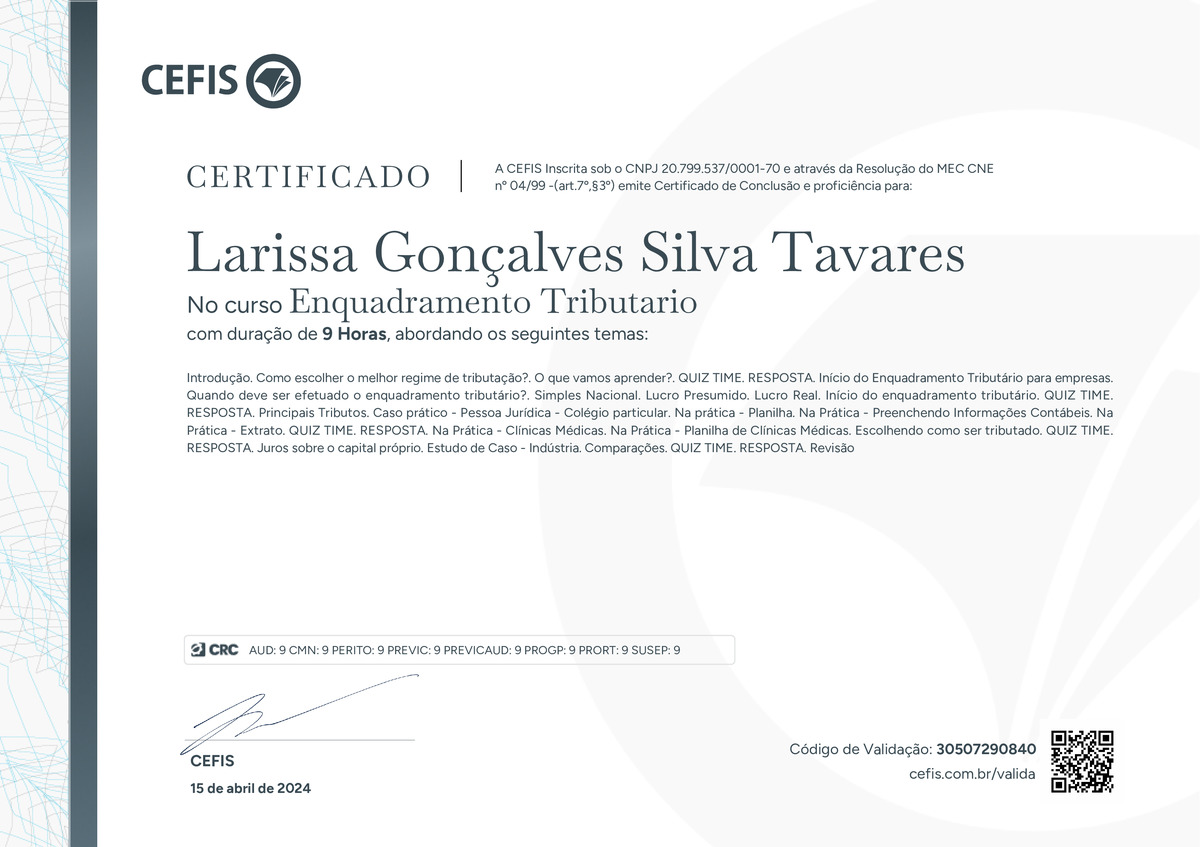 O certificado acima atesta que LARISSA GONÇALVES SILVA TAVARES concluiu com êxito o curso Enquadramento Tributario em 15/04/2024 às 23:04:04, ministrado por RICARDO PRADO.