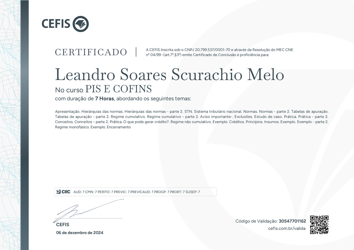 O certificado acima atesta que Leandro Soares Scurachio Melo concluiu com êxito o curso PIS E COFINS em 06/12/2024 às 12:12:35, ministrado por Douglas Campanini.