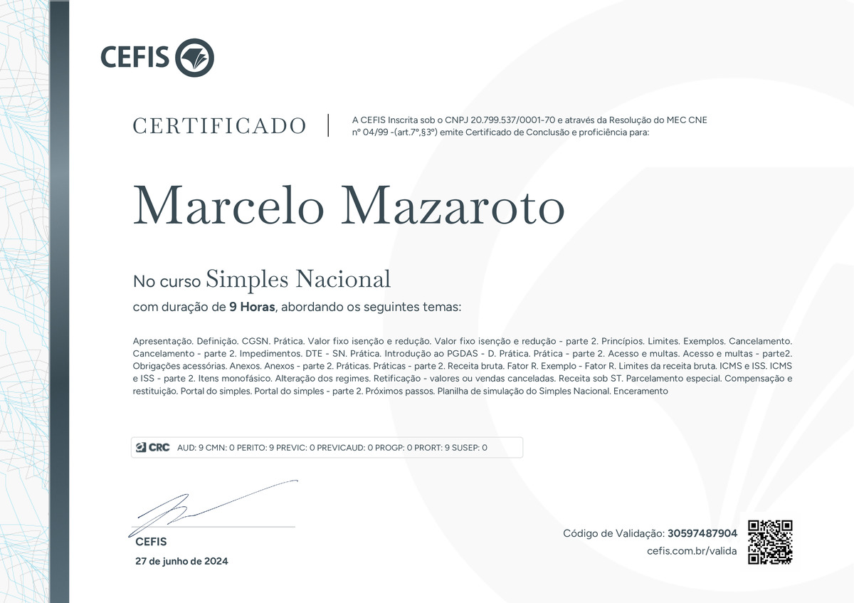 O certificado acima atesta que MARCELO MAZAROTO concluiu com êxito o curso Simples Nacional em 27/06/2024 às 22:06:35,